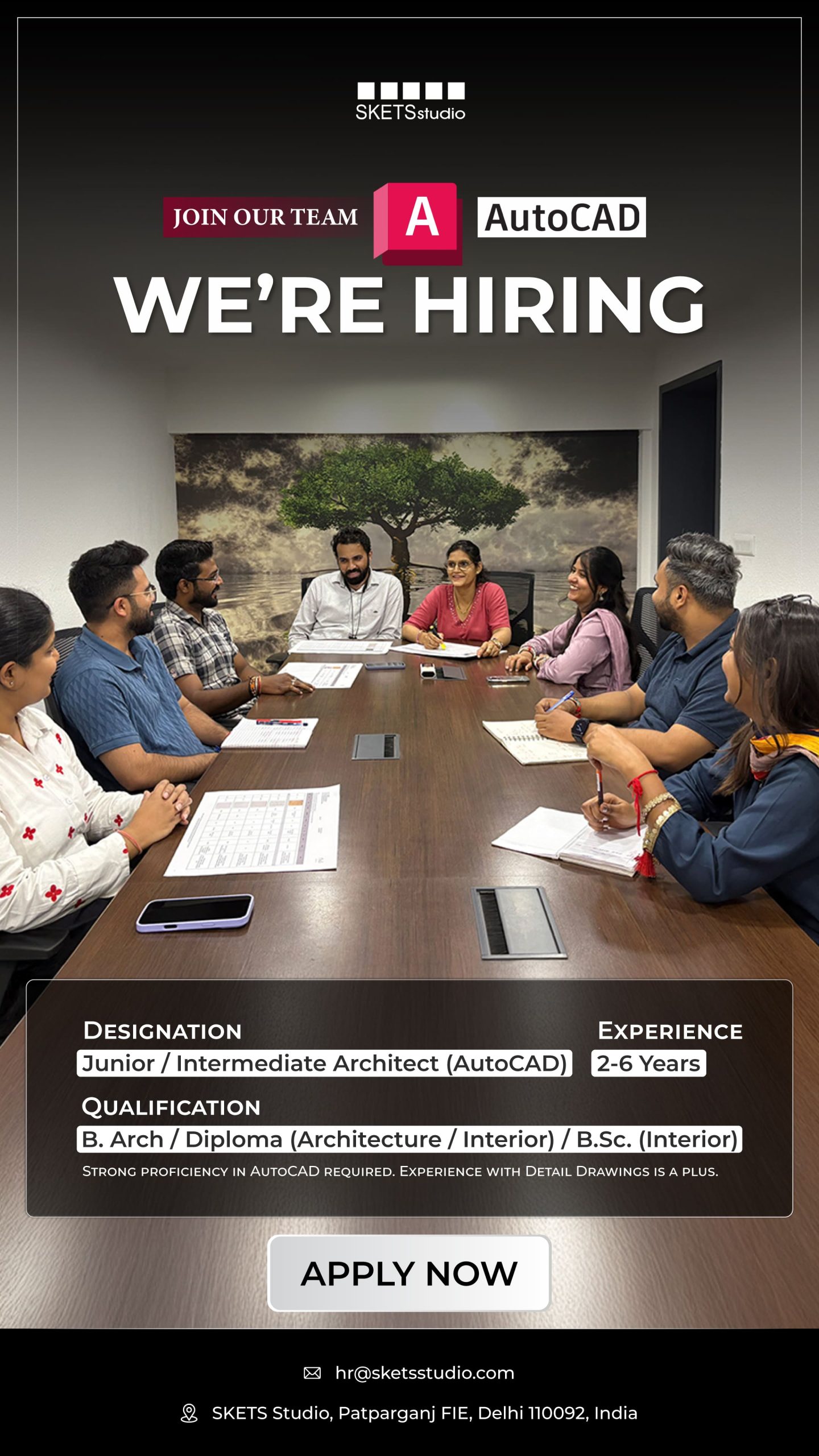 1–5 years of experience in interior working drawings (more for senior roles).